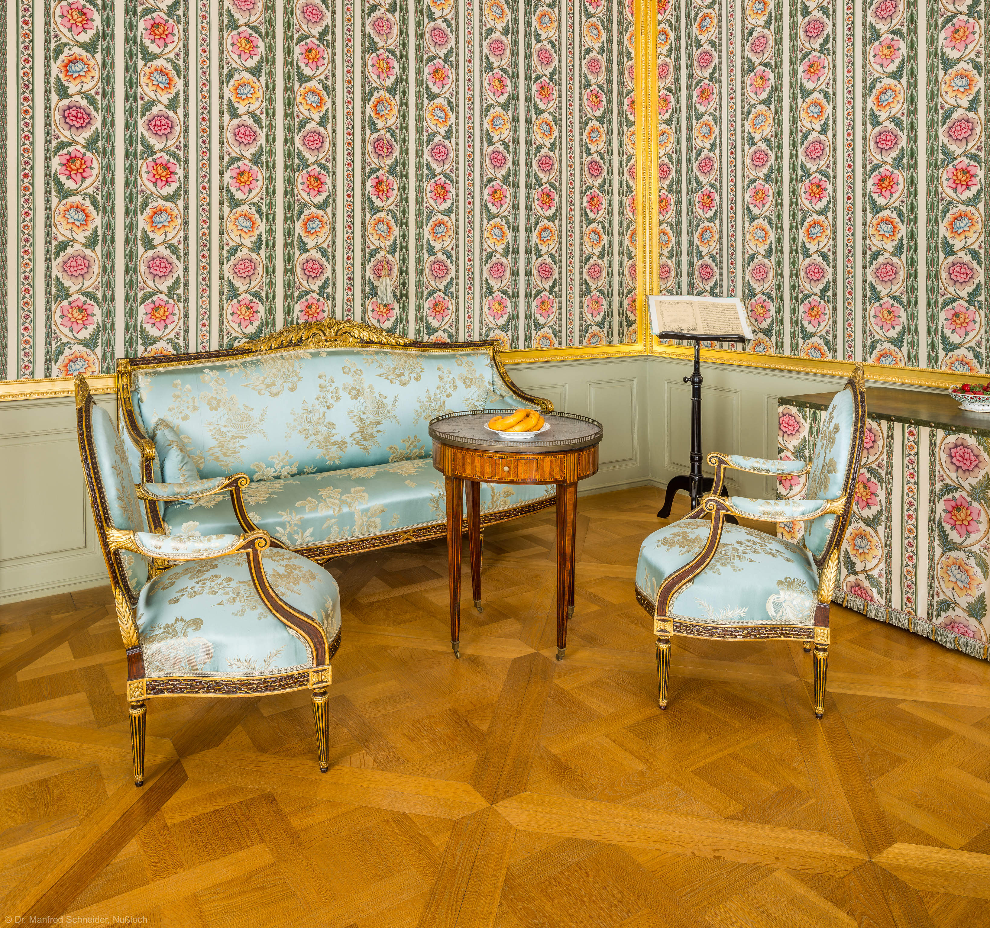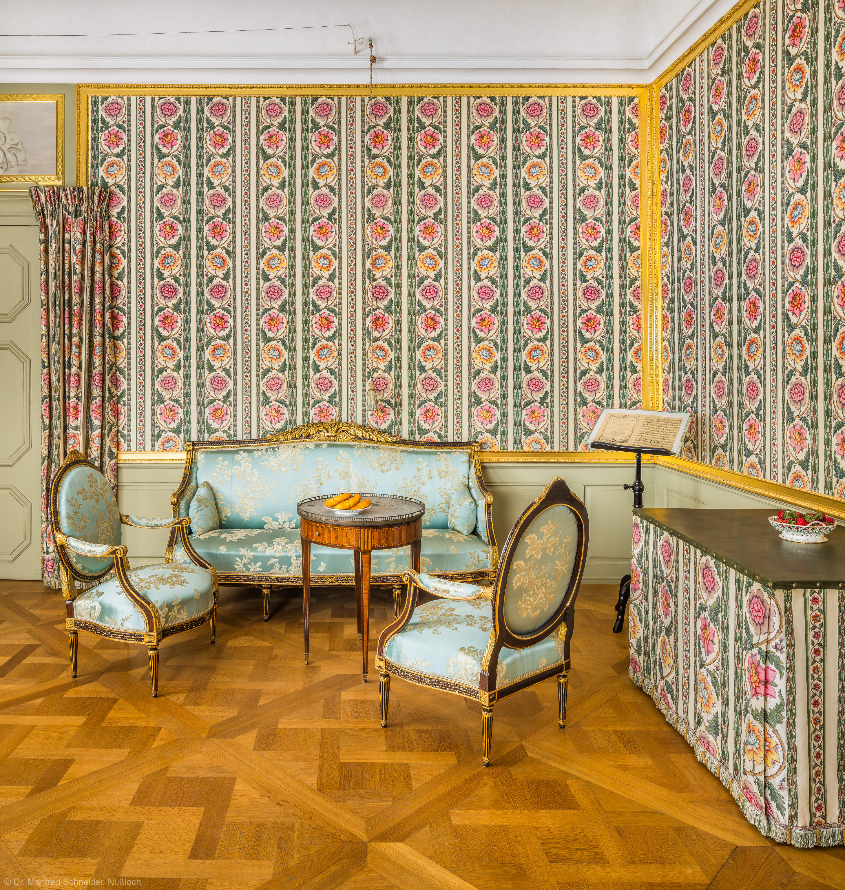 Schloss und Schlossgarten Schwetzingen - Schloss - Mittelbau - Von innen - 1. Obergeschoss - Appartment des Kurfürsten - Schlafzimmer - Ost- und Südwand - Von Westen - Blick Richtung Ostwand auf die Sitzgruppe, bestehend aus einem Canapé, zwei Medaillon-Sesseln und einem Tisch), rechts ein Notenpult und ein Toilettentisch, ganz links die Tür zum zweiten Vorzimmer (aufgenommen im Januar 2026, am frühen Nachmittag)