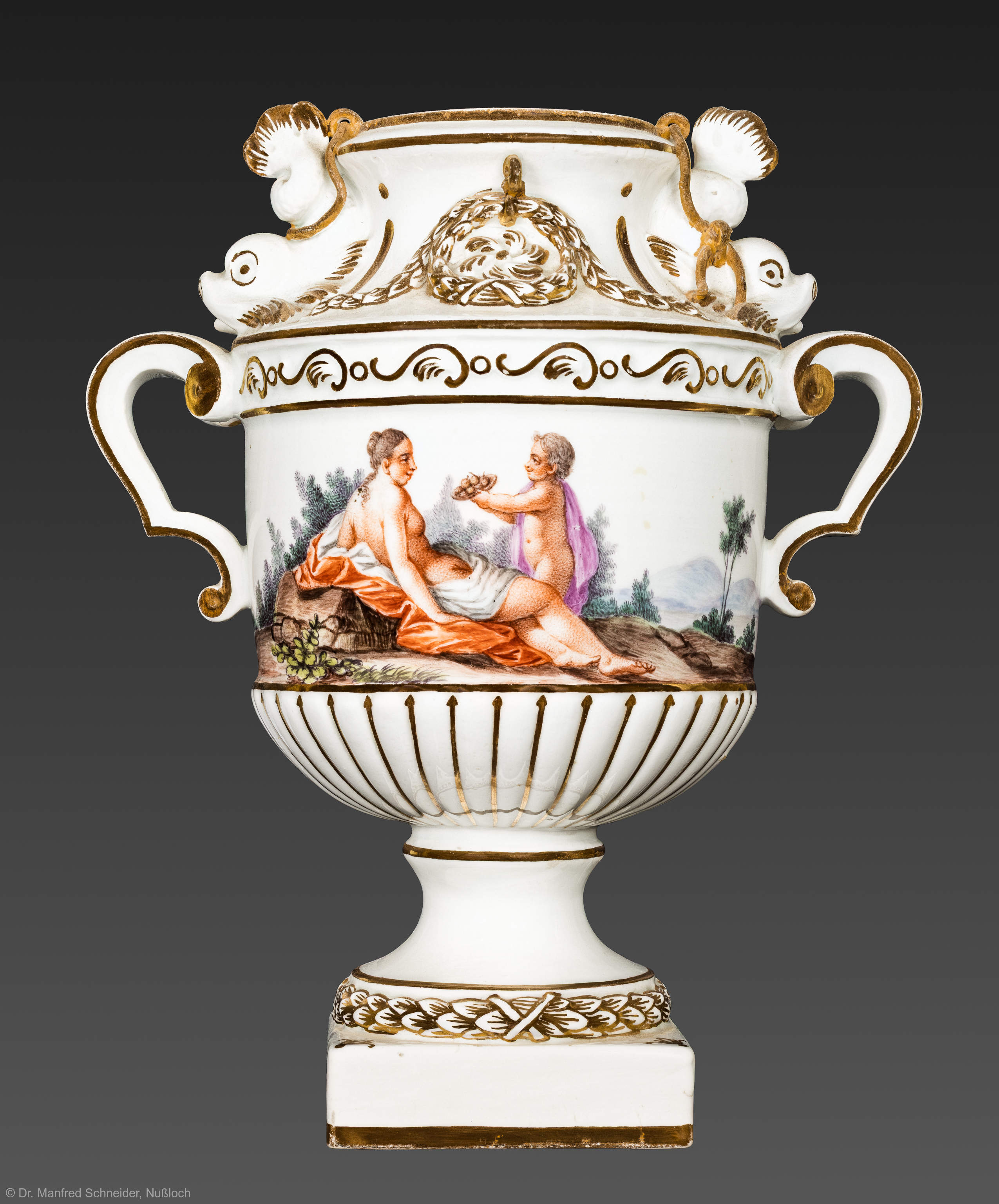 Schloss und Schlossgarten Schwetzingen - Schloss - Mittelbau - Von innen - 1. Obergeschoss - Appartment des Kurfürsten - Schlafzimmer - Südwand, Kamin - Urnenvase (Manufaktur: Frankenthal, Datierung: 1775, Material: Porzellan) (aufgenommen im Januar 2026, am Nachmittag)