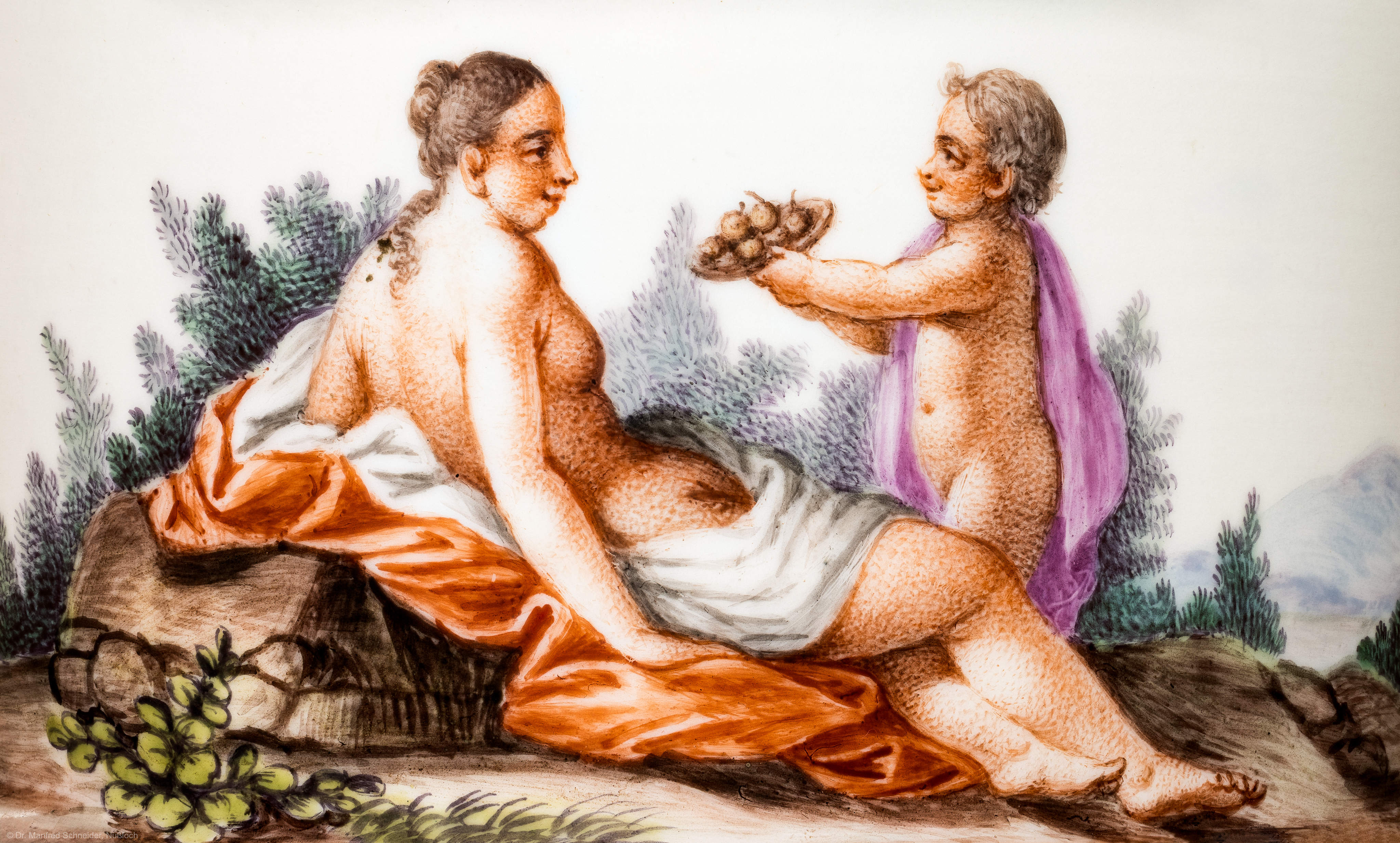 Schloss und Schlossgarten Schwetzingen - Schloss - Mittelbau - Von innen - 1. Obergeschoss - Appartment des Kurfürsten - Schlafzimmer - Südwand, Kamin - Ausschnitt mit dem Bildmotiv aus einer Urnenvase (Manufaktur: Frankenthal, Datierung: 1775, Material: Porzellan) (aufgenommen im Januar 2026, am Nachmittag)